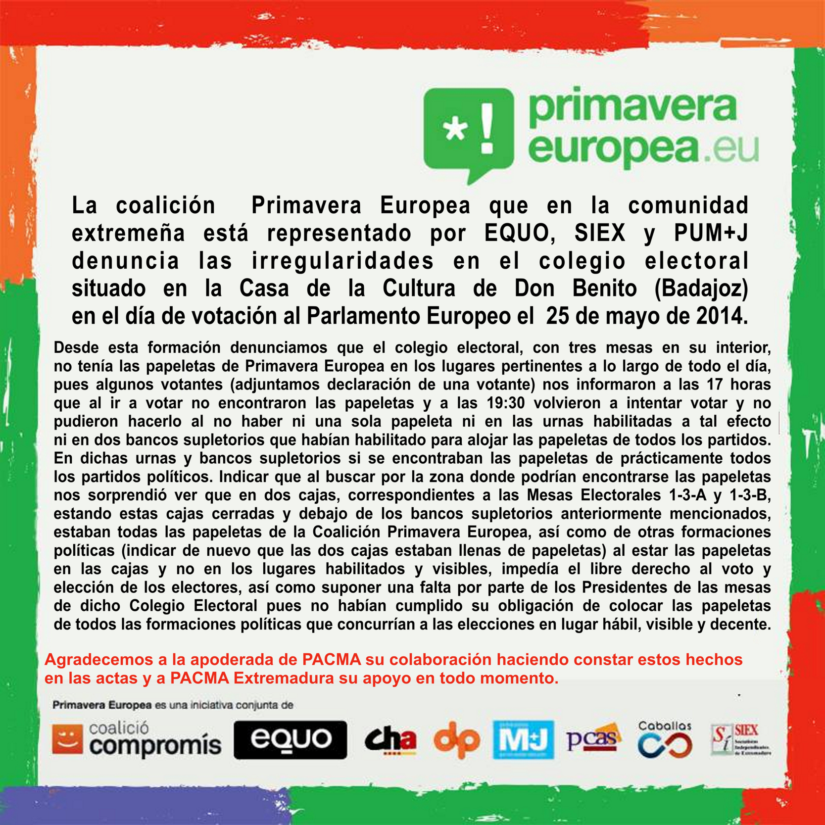 La coalición de ocho partidos políticos Primavera Europea que en la comunidad extremeña está representado por EQUO, SIEX y PUM+J denuncia las irregularidades en el colegio electoral situado en la Casa de la Cultura de Don Benito (Badajoz) en el día de votación de ayer 25 de mayo. Desde esta formación denunciamos que el […]